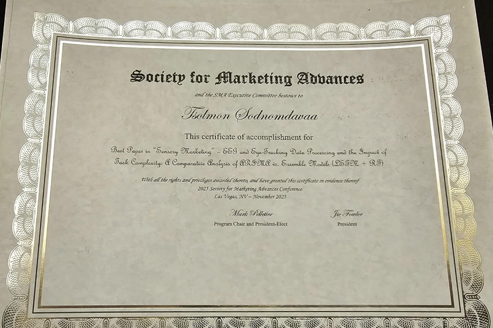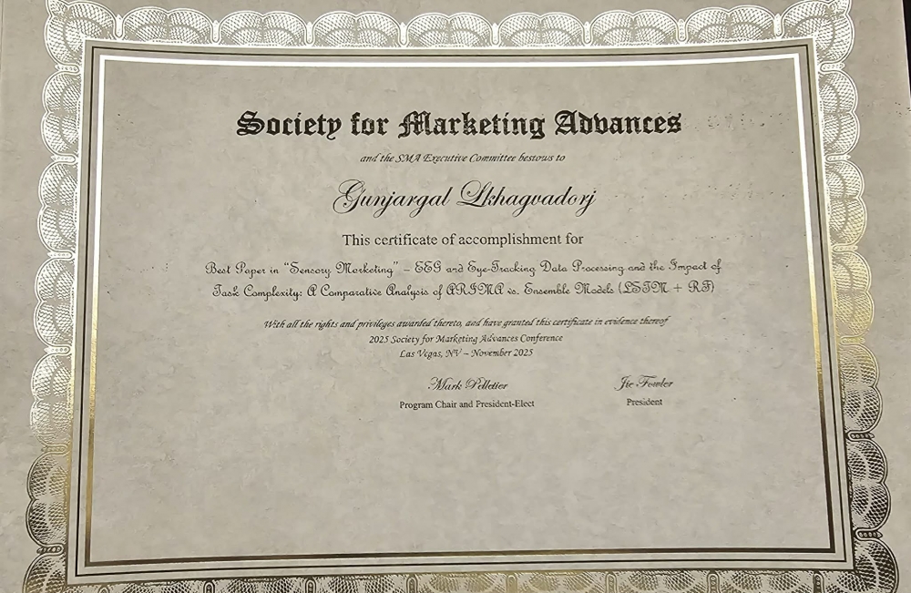 Out of a total of 337 papers presented at the conference, a joint paper by Mandakh University faculty members S. Tsolmon (Ph.D, Professor) and L. Gunjargal (Ph.D, Senior Lecturer), titled “Processing EEG and Eye-Tracking Data and the Impact of Task Complexity: A Comparative Analysis of ARIMA and Ensemble Models,” was presented and awarded the “Best Paper Award” in the Sensory Marketing session.