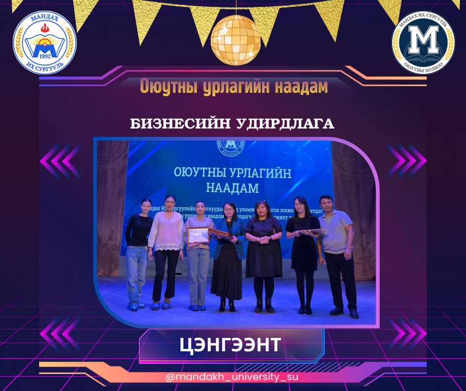Overall Results: • 1st Place: Finance & Banking (Class 1–1), taught by lecturer G. Erdenetsogt of the Department of Economics and Business • 2nd Place: Software Engineering & Information Technology, taught by lecturer B. Tuyatsetseg of the Department of Computer Science • 3rd Place: Accounting (Class 1–3), taught by senior lecturer D. Tsevelmaa of the Department of Accounting and Analysis